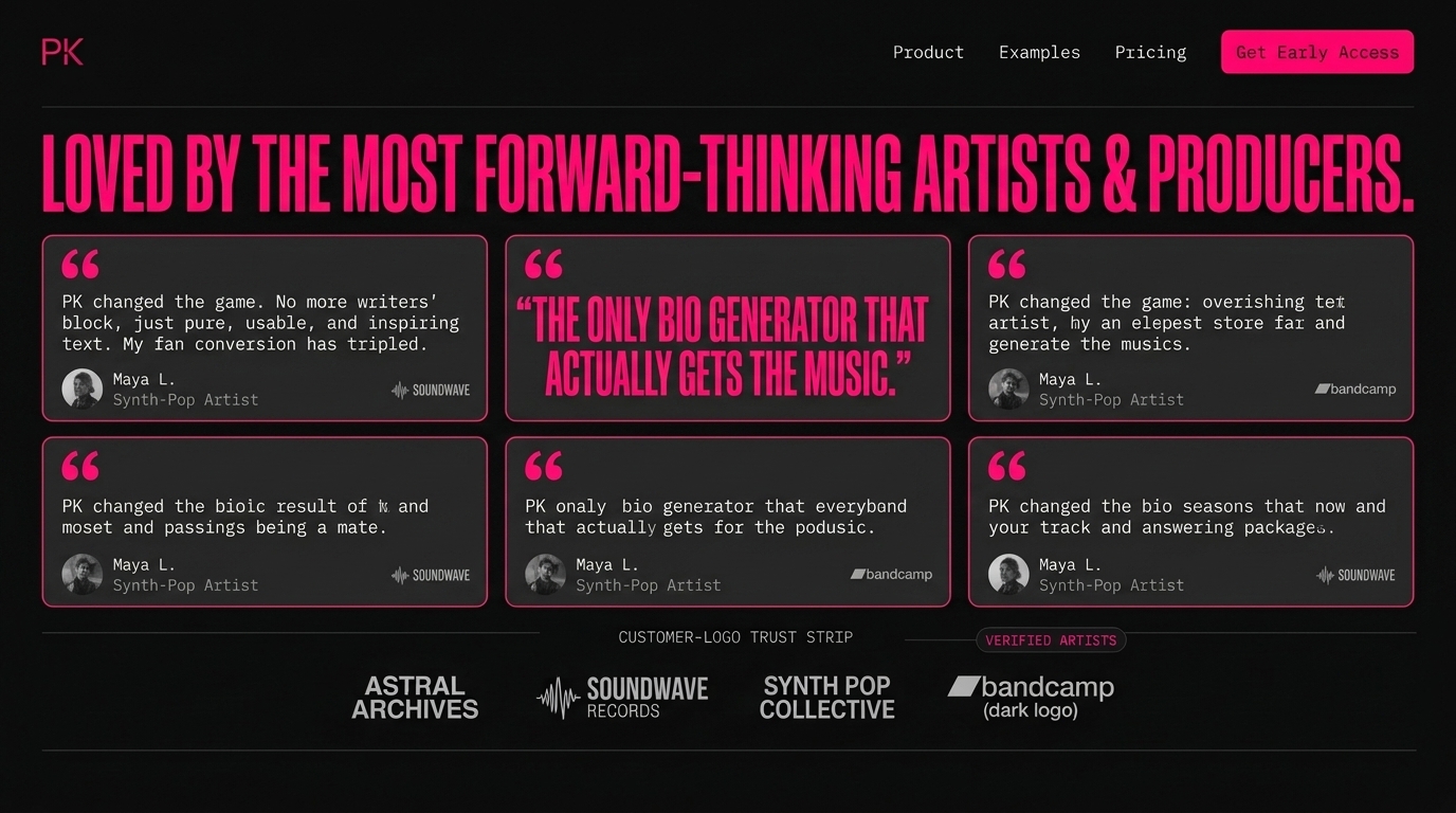 The image showcases testimonials praising a bio generator tool for artists and producers, highlighting its effectiveness and popularity in the music industry.