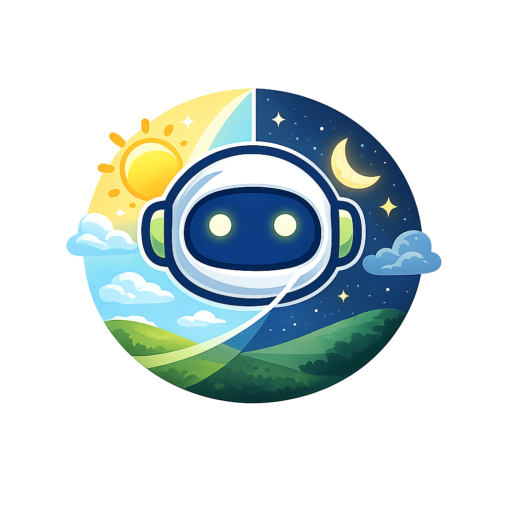 A playful robot icon is split between day and night themes. One side features a bright sun and blue skies, while the other showcases a moon and stars, symbolizing balance.