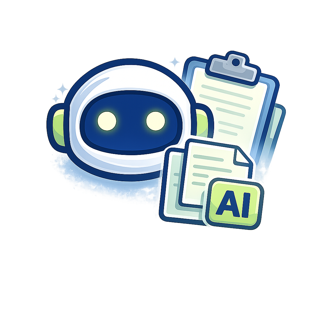 A whimsical cartoon robot with a round head and large eyes, surrounded by documents and an 'AI' label, symbolizing artificial intelligence and data management.