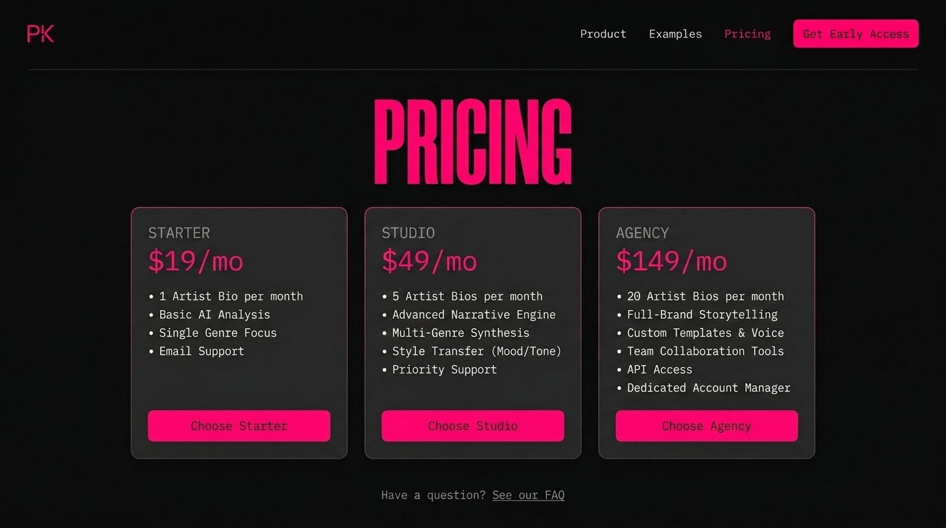 This image showcases the pricing plans for PK, featuring three tiers: Starter, Studio, and Agency, each with distinct services and monthly costs.