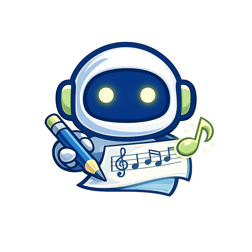 A charming cartoon robot with bright eyes, holding a pen and a sheet of music. The background is dark, enhancing the robot's colorful features, symbolizing creativity in music.