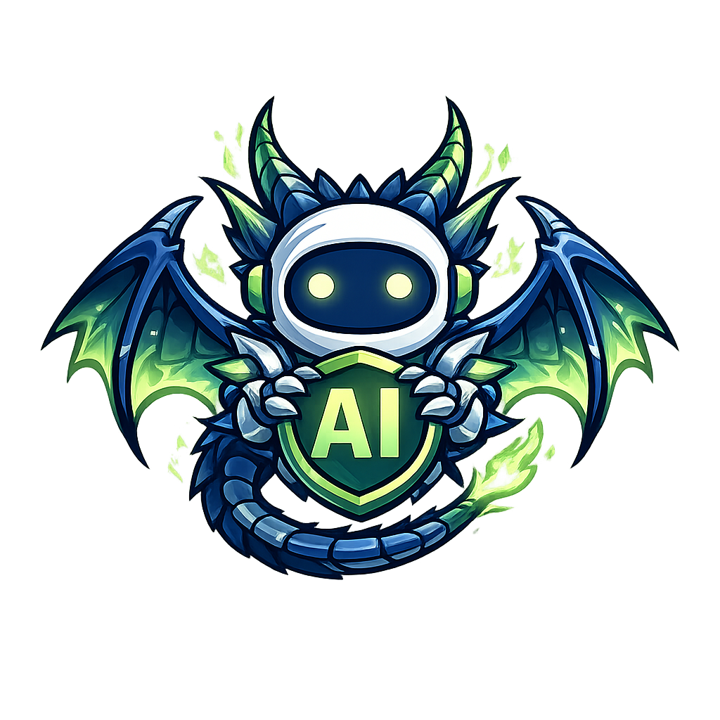 A vibrant and futuristic dragon robot mascot holds a shield with 'AI' inscribed on it. The design features glowing accents and intricate details, blending technology with mythical elements.