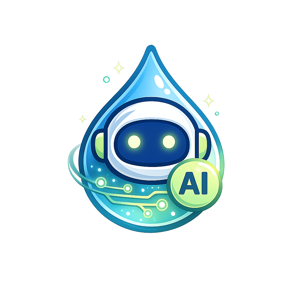 A vibrant logo featuring a water drop with a friendly robot face and circuitry patterns, symbolizing artificial intelligence and innovation.