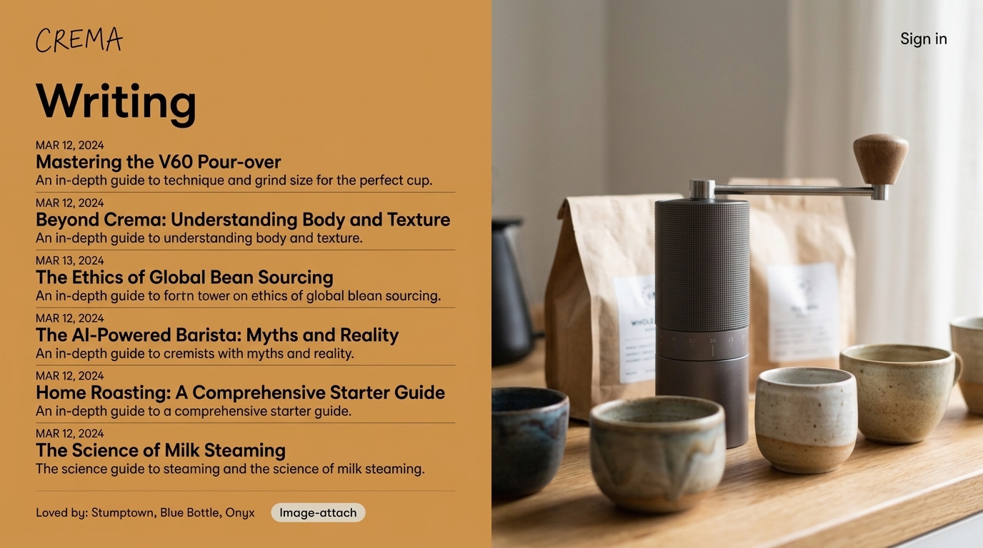 A visually appealing layout featuring multiple articles about coffee brewing techniques, sourcing, and preparation. It includes titles, dates, and a sign-in option.
