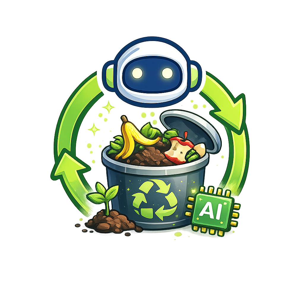 An imaginative illustration depicting a trash can filled with organic waste like bananas and apples, surrounded by recycling symbols and an AI chip, symbolizing eco-friendly technology.