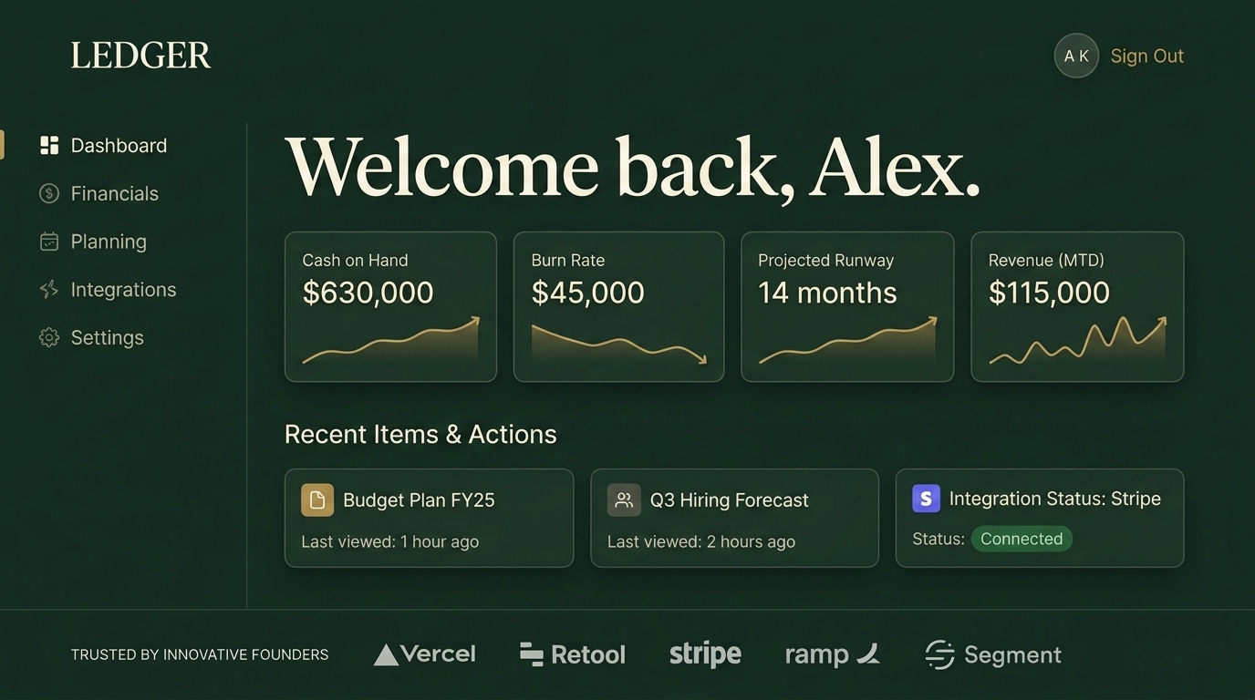 A sleek user interface displaying financial metrics including cash on hand, burn rate, projected runway, and monthly revenue, along with recent actions.