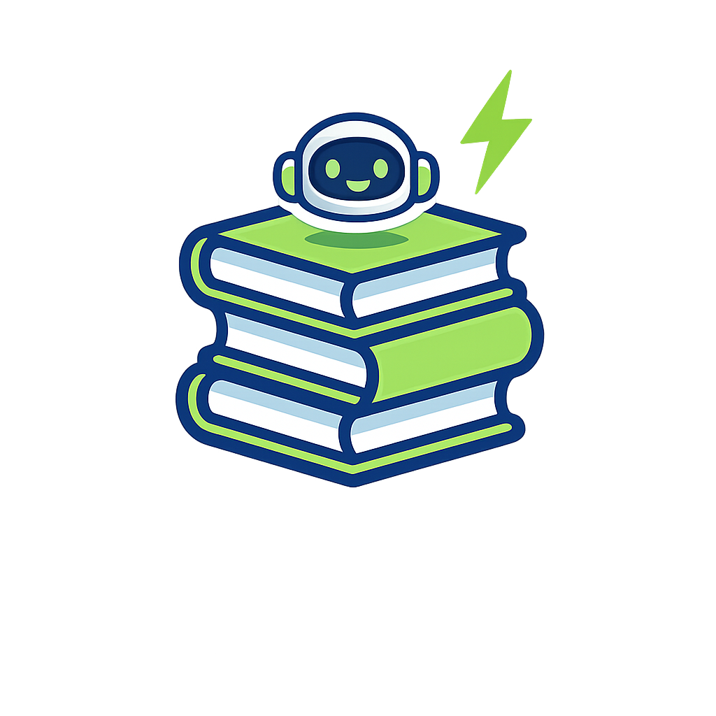 An imaginative design featuring a cute robot character perched atop a stack of colorful books, symbolizing knowledge and technology.