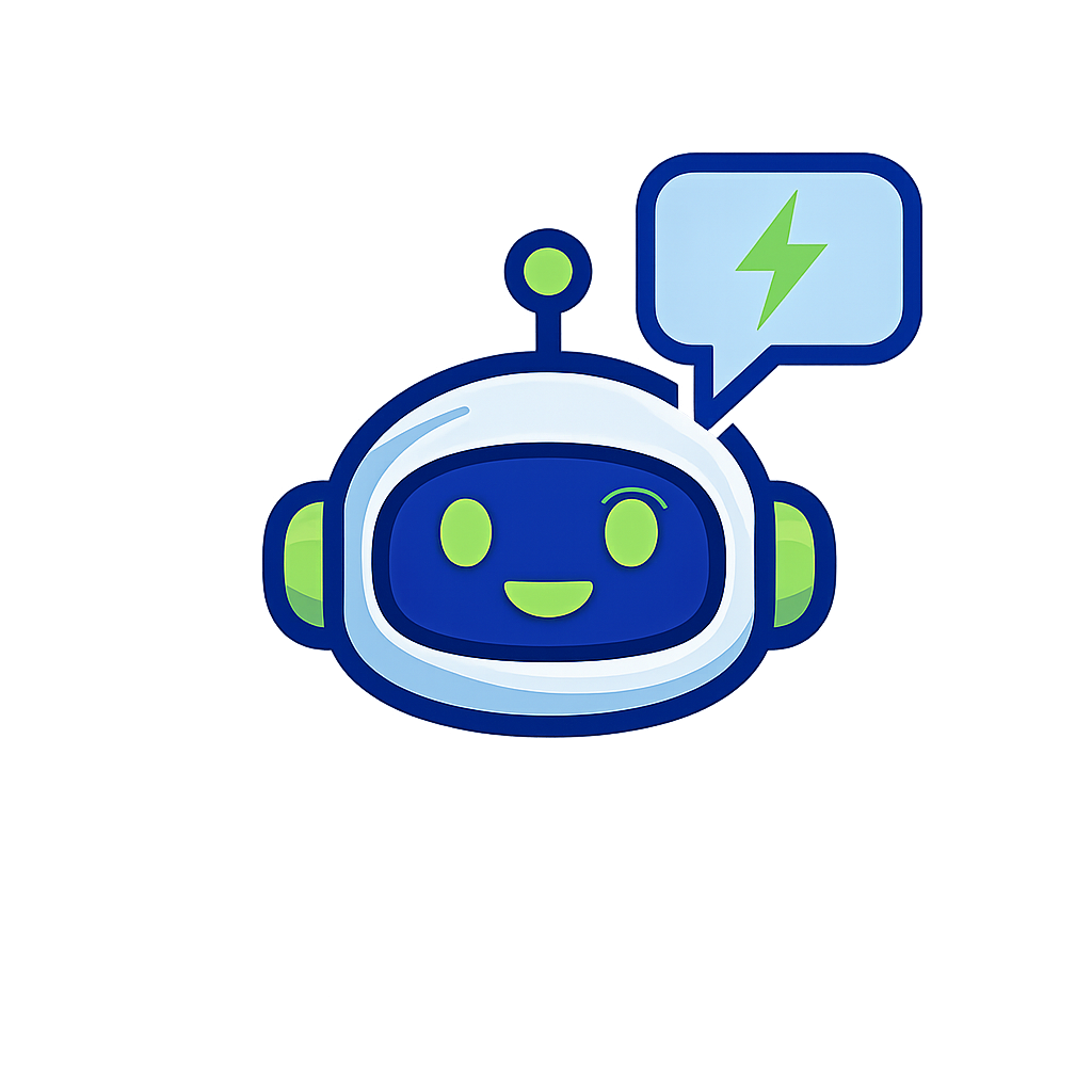A cheerful robot character with a blue and green color scheme, featuring a speech bubble with a lightning bolt, symbolizing communication and energy.
