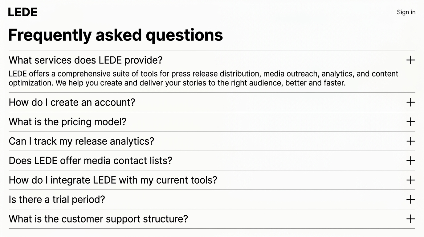 A list of frequently asked questions regarding LEDE services, covering topics like account creation, pricing models, analytics tracking, media contact lists, and customer support.