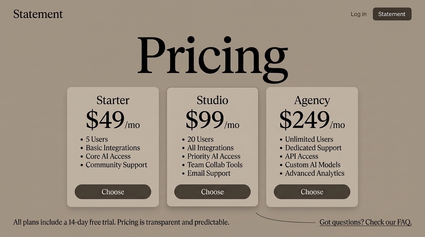 A pricing table presenting three plans: Starter, Studio, and Agency, each with distinct features and monthly costs. Clear and user-friendly layout.