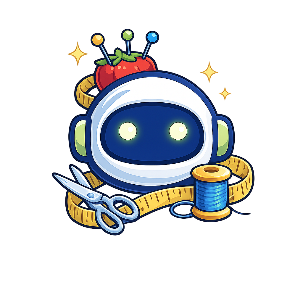 A whimsical robot character featuring bright eyes, surrounded by sewing tools like scissors, a thread spool, and a tomato pin cushion, set against a dark background.