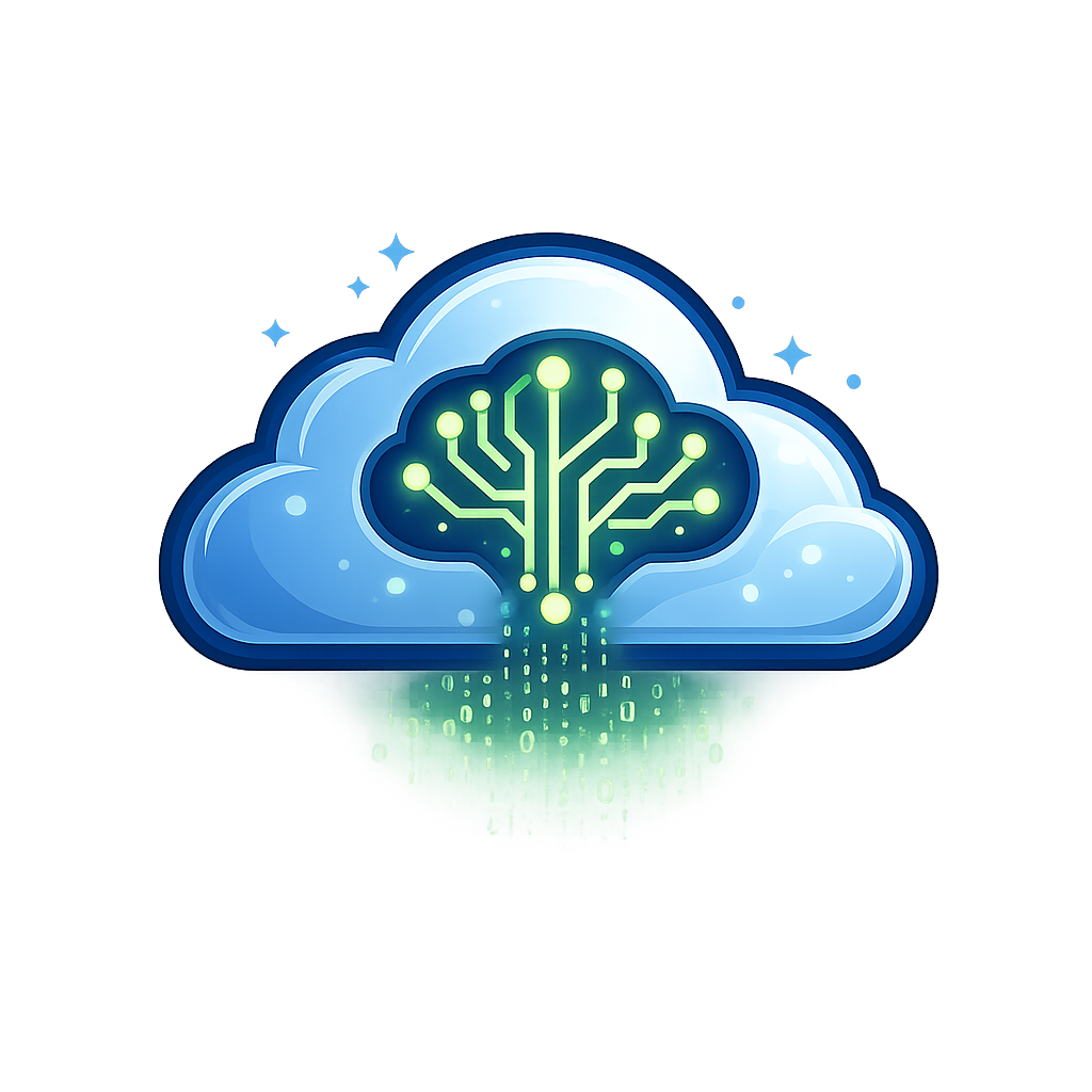 An imaginative illustration of a cloud with a circuit tree design, symbolizing cloud computing and data flow. The cloud is accented by glowing elements and binary code.