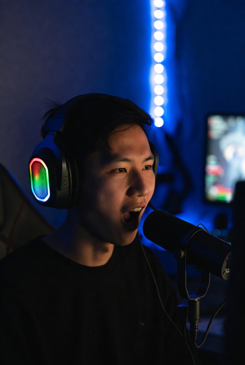 Young Gamer Engaged in Live Streaming with RGB Headphones