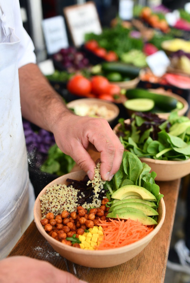 A chef's hand carefully garnishes a colorful salad bowl filled with quinoa, chickpeas, fresh greens, avocado, and sliced vegetables, showcasing healthy eating.