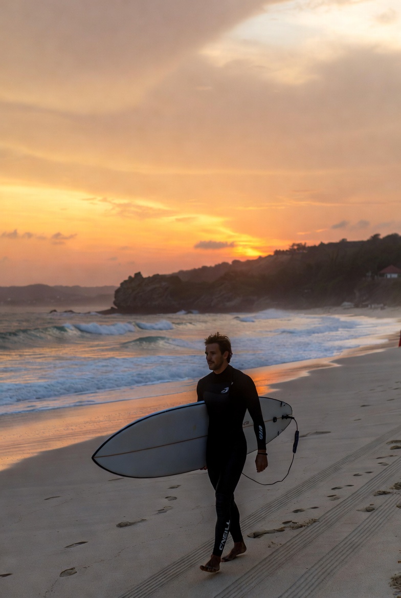 A surfer in a black wetsuit walks along a sandy beach during sunset. The sky is painted with warm hues, and gentle waves lap at the shore.
