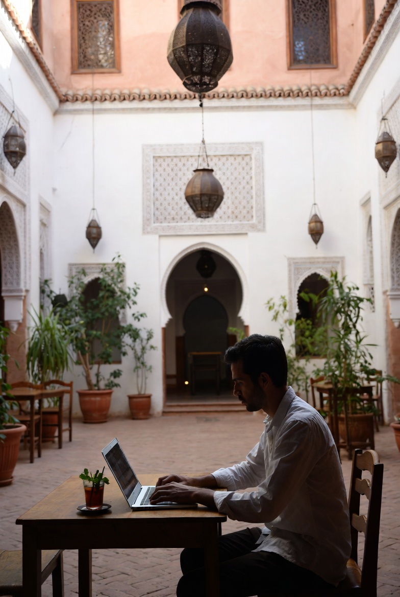 A man sits at a wooden table in a traditional Moroccan courtyard, working intently on his laptop. The serene setting features lush plants and ornate lanterns.
