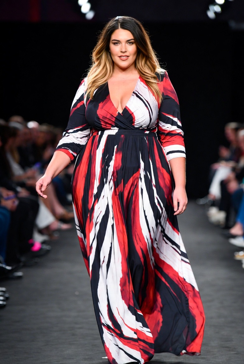 A confident plus-size model walks down the runway, showcasing a vibrant striped dress in red, black, and white. The audience watches attentively.