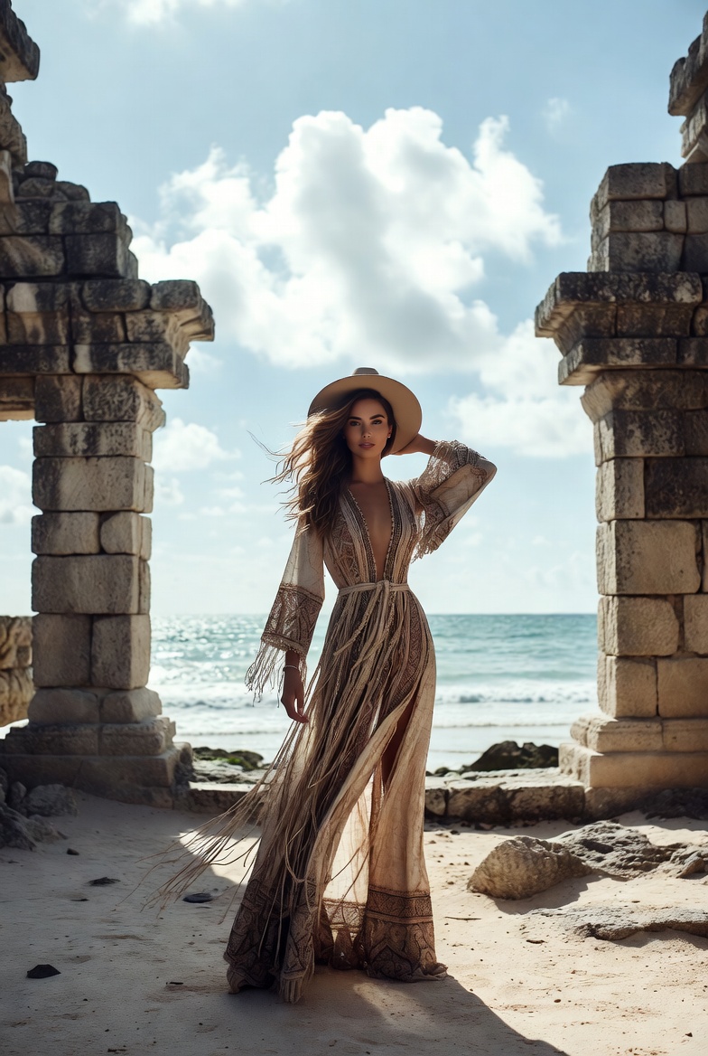 A stunning fashion model poses gracefully near ancient stone ruins by the beach, wearing an intricate dress and wide-brimmed hat, with waves and clouds in the background.