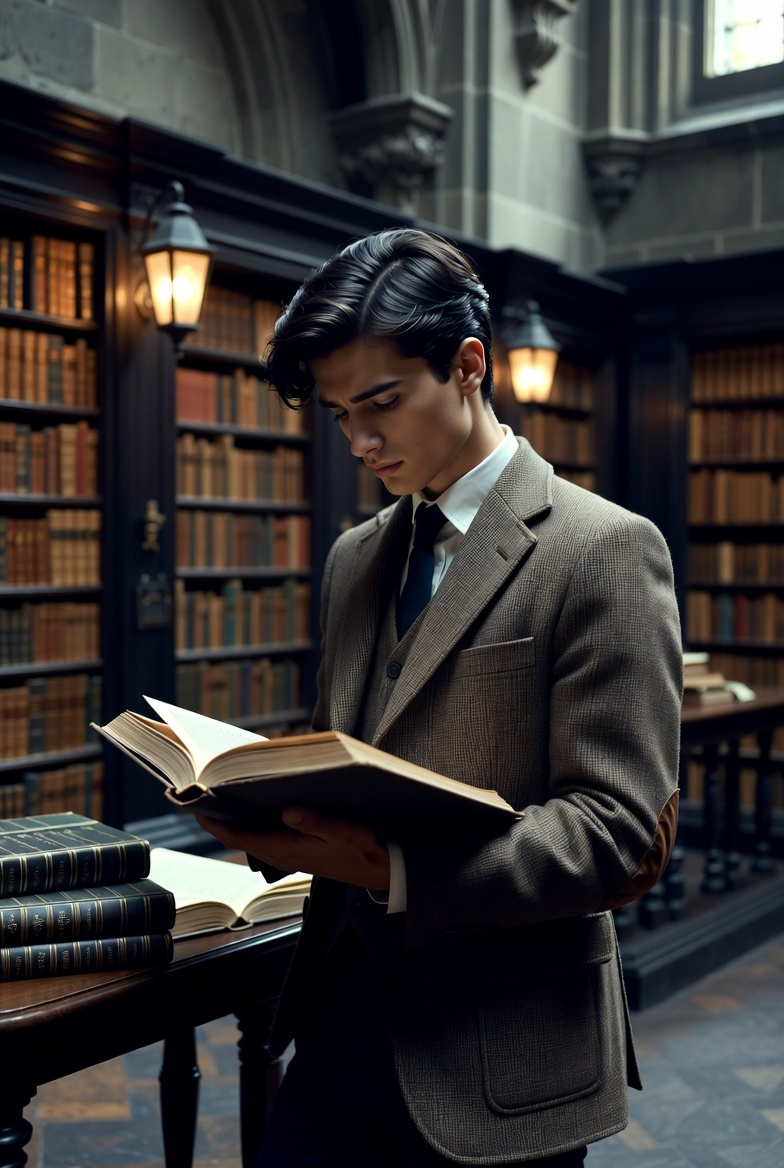 A young man in a vintage suit reads a book in a grand library filled with tall bookshelves. Warm lighting creates a scholarly atmosphere.