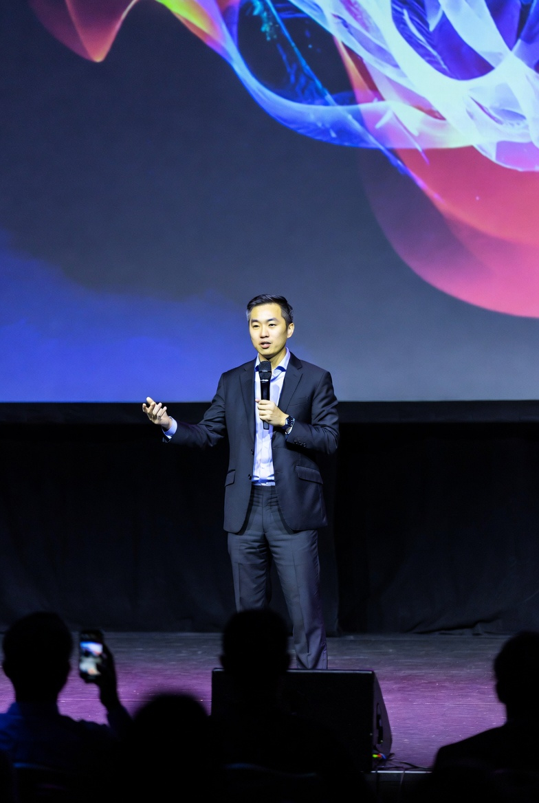 A professional speaker presenting on stage at a conference, engaging the audience with dynamic gestures and a confident demeanor. The backdrop features vibrant colors, enhancing the energetic atmosphere.