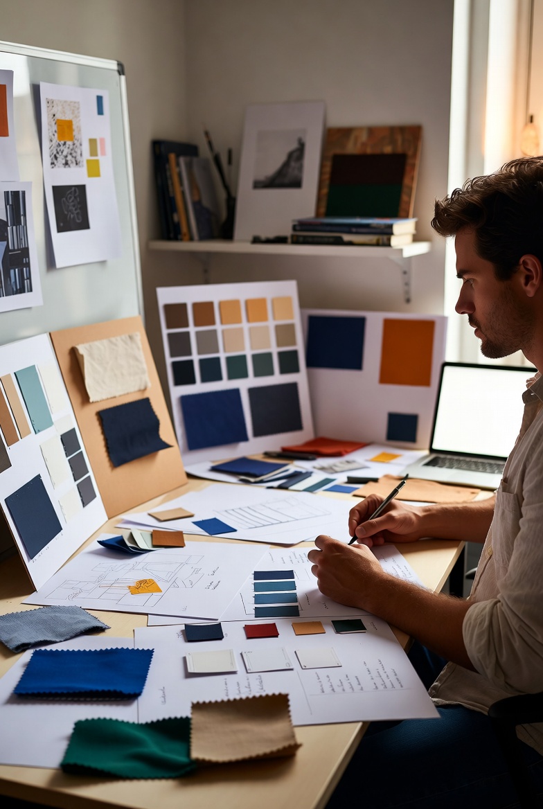 A designer is working at a table filled with fabric swatches, color palettes, and design notes. The workspace features mood boards and an organized layout that inspires creativity.