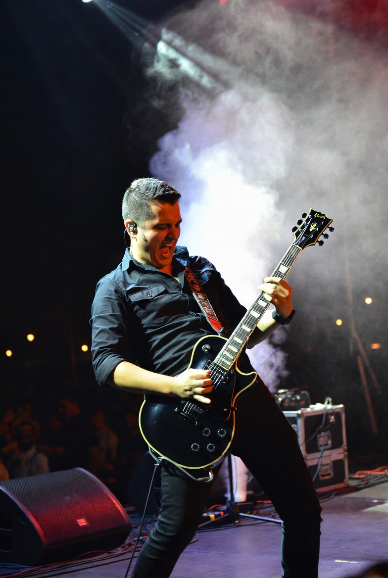 A passionate guitarist plays an electric guitar on stage, showcasing intense emotion. The venue is illuminated with stage lights and smoke effects, creating an electrifying atmosphere.