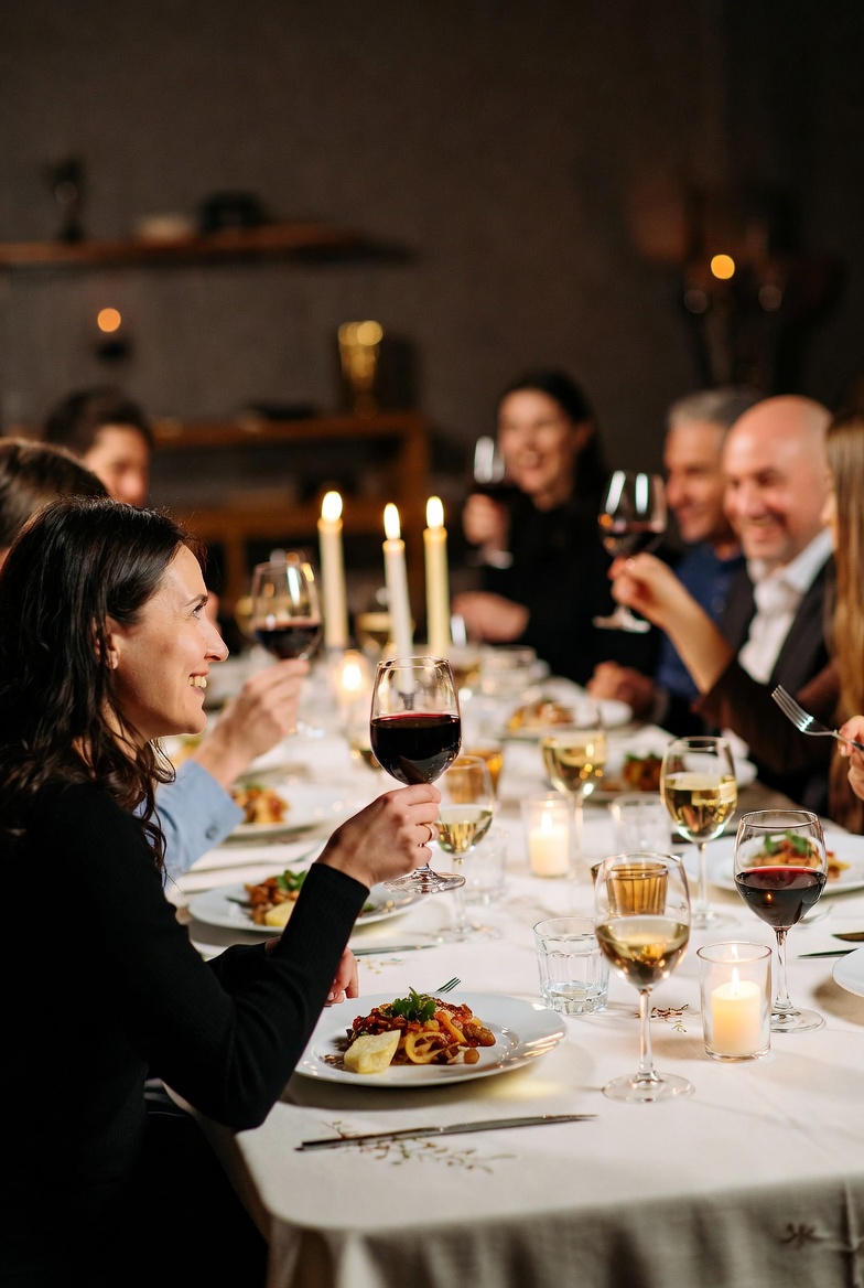 Elegant Dinner Gathering with Food and Wine