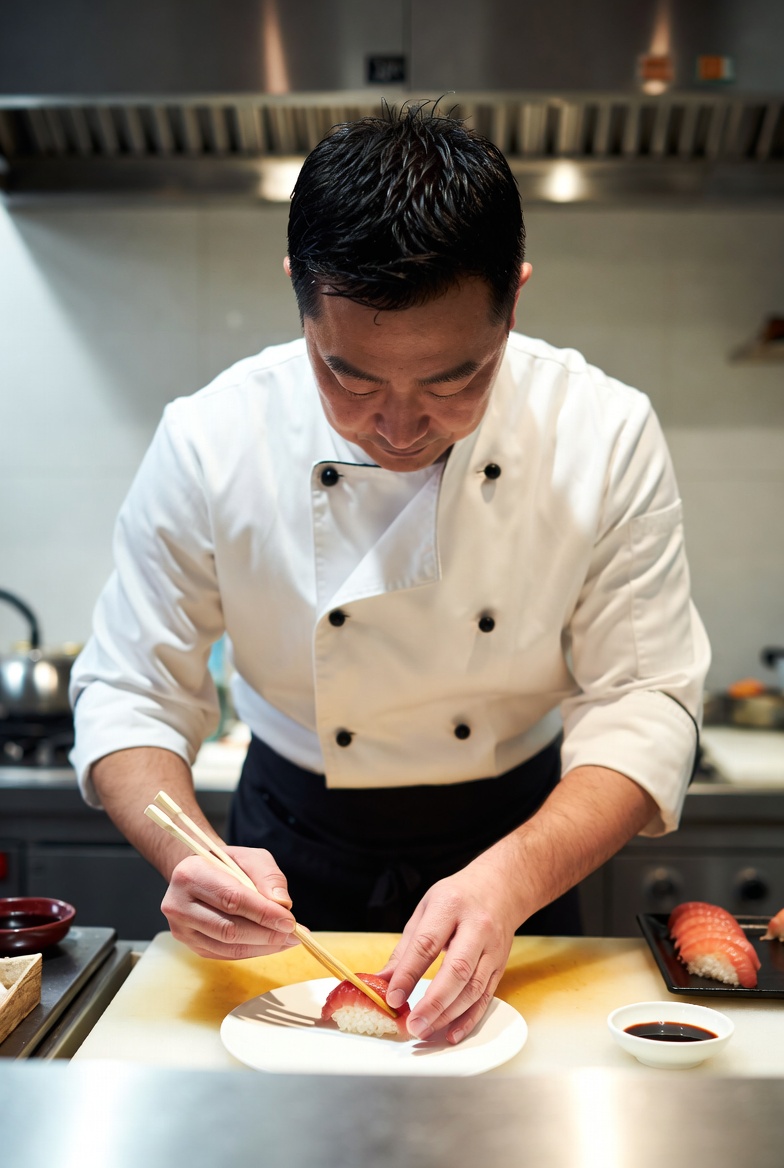 A skilled sushi chef focuses intently on crafting a sushi roll, using chopsticks to position the ingredients. The kitchen is well-equipped with tools, and fresh sushi is visible.