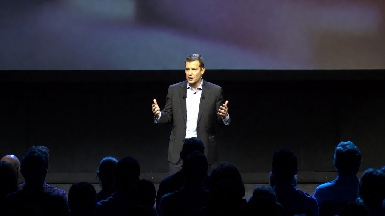 A presenter stands confidently on stage, addressing an audience. The speaker gestures with hands while delivering a talk, set against a dark background.