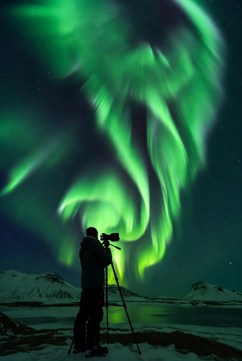A silhouette of a photographer stands with a camera on a tripod, capturing the breathtaking aurora borealis. The vibrant green lights dance in the night sky over a snowy landscape.