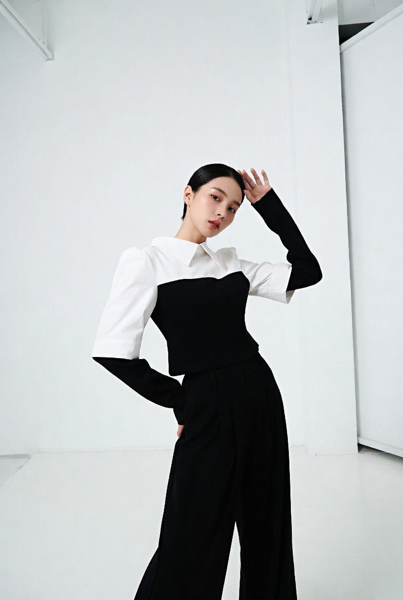 A stylish model showcases a trendy monochrome outfit featuring a structured black and white design. The setting is minimalistic with a clean white background.
