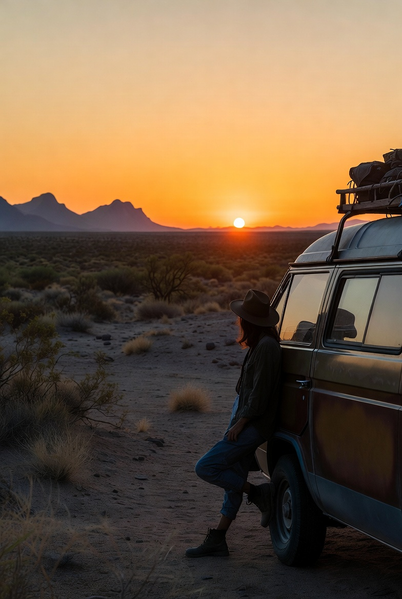 A serene scene of a traveler leaning against a vintage van during sunset in a desert landscape. The warm hues of the setting sun cast a beautiful glow over the mountains and sandy terrain.
