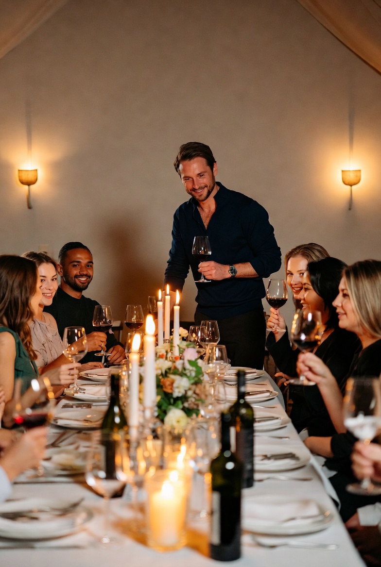 A vibrant dinner scene featuring a group of elegantly dressed guests enjoying a toast. Candles and flowers adorn the table, creating a warm atmosphere.
