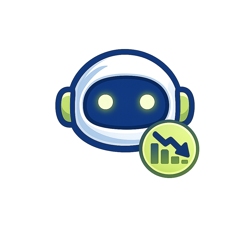 A playful robot character with large eyes and a white helmet, accompanied by a green downward trend icon. The design features a modern and sleek aesthetic, suitable for technology themes.