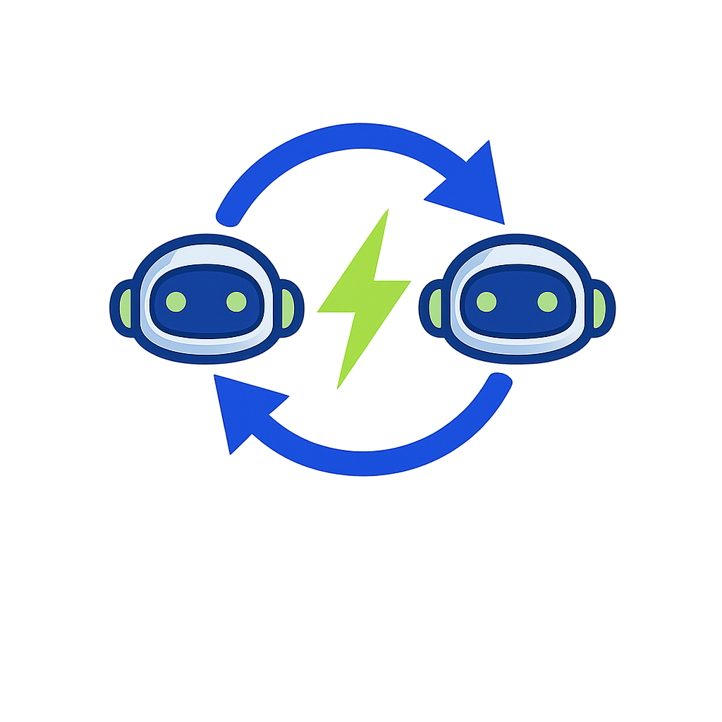 An illustration featuring two cartoonish robots with glowing eyes, surrounded by a circular arrow and a lightning bolt, symbolizing energy exchange or recycling.