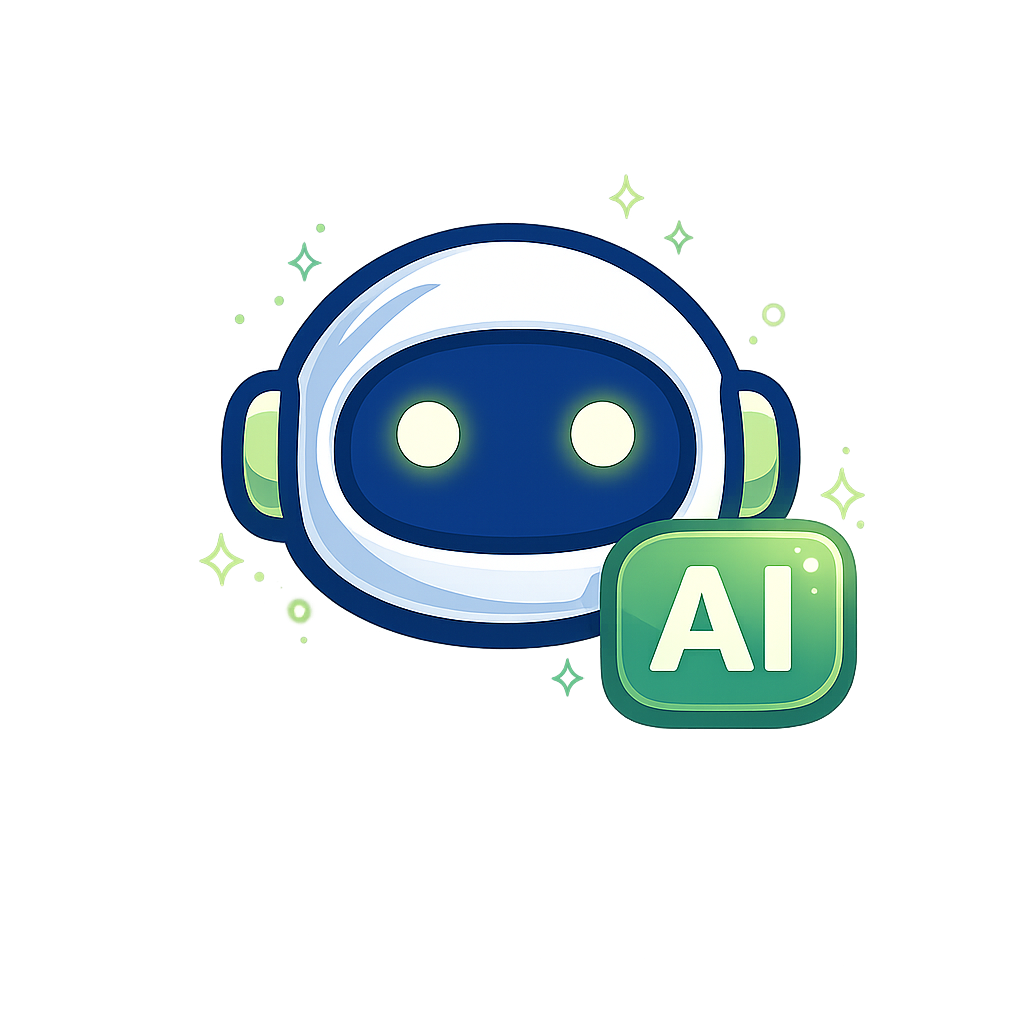 A vibrant illustration of a friendly robot with a white helmet and glowing eyes, accompanied by an 'AI' logo in a green box. The background features soft, glowing effects.