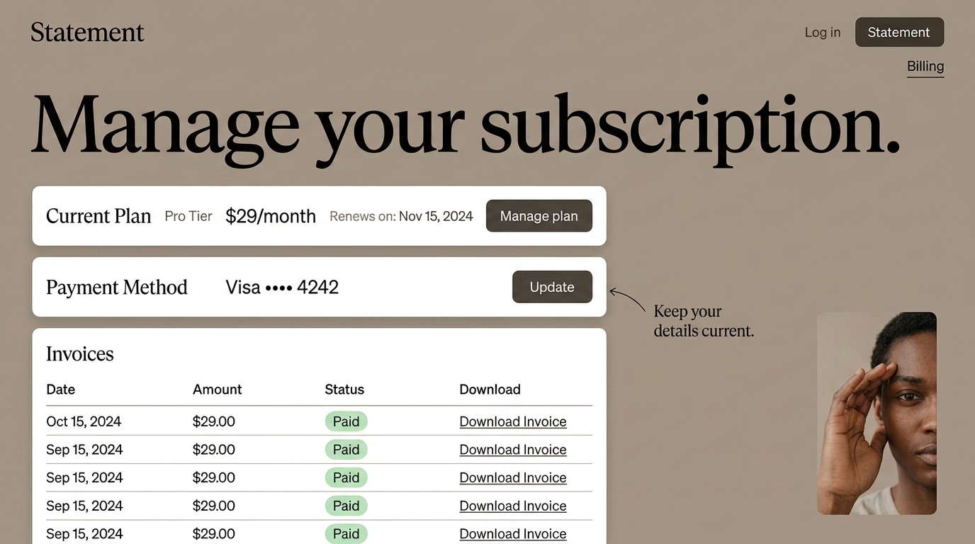 A screenshot of a subscription management interface displaying current plan details, payment method, and invoice history. It features user-friendly elements for managing subscriptions.