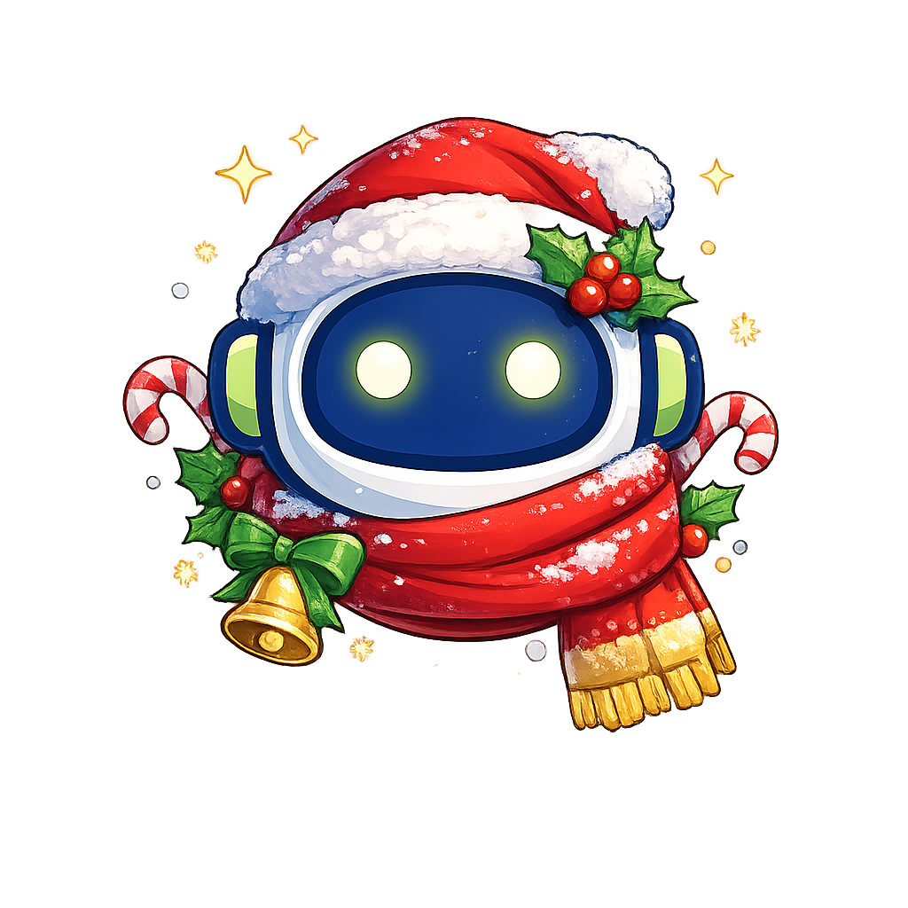 A cheerful robot adorned with a festive red scarf and Santa hat, surrounded by holiday decorations like holly and candy canes, exuding a joyful Christmas spirit.
