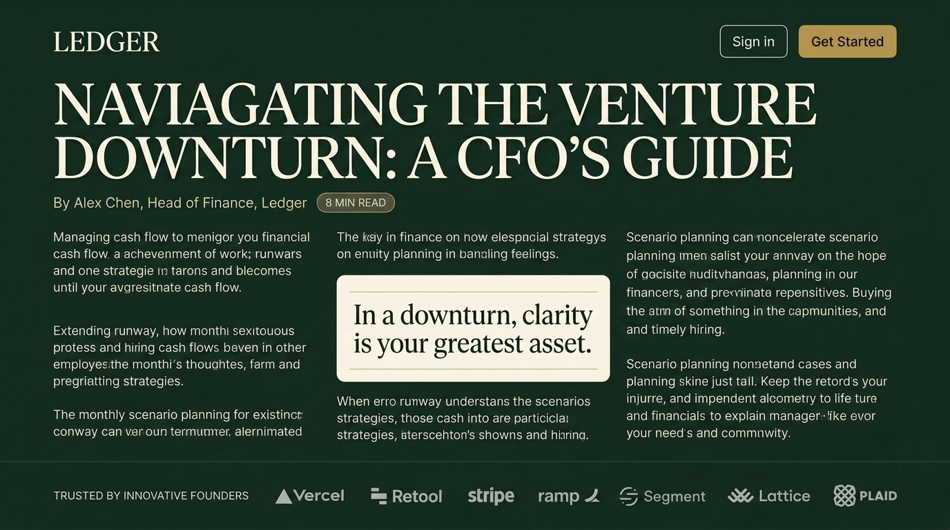 This image features an article titled 'Navigating the Venture Downturn: A CFO's Guide', focusing on financial strategies for CFOs during economic downturns. It emphasizes clarity and planning.