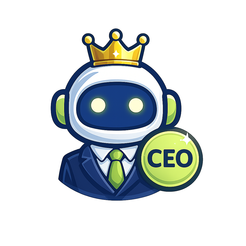 A cartoon-style robot character wearing a suit and a crown, holding a badge labeled 'CEO'. The design is vibrant with glowing elements, suitable for tech and business themes.