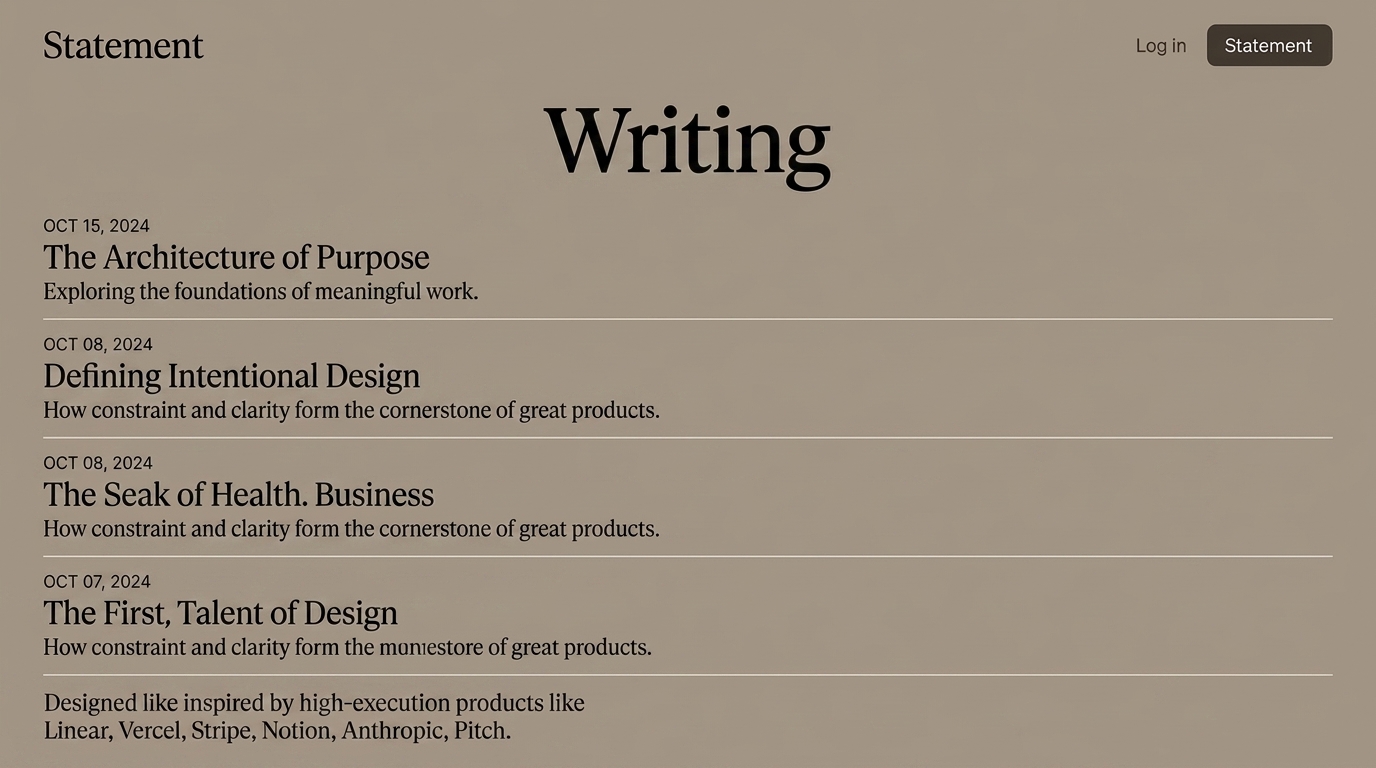 A clean layout presenting writing statements with dates and topics. Each entry highlights themes like design, health, and talent, emphasizing clarity and purpose.