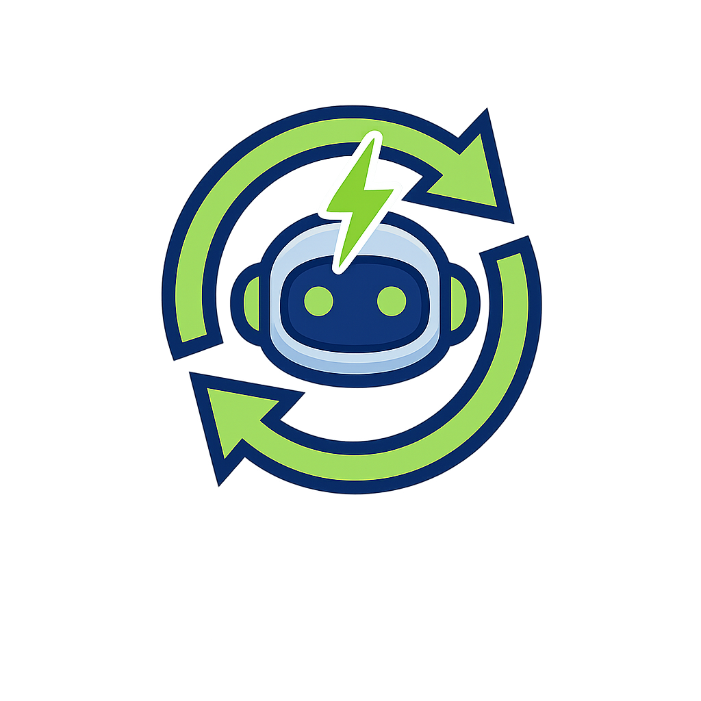 A sleek robot icon featuring a refresh symbol and a lightning bolt, representing technology and energy. The design incorporates blue and green colors on a dark background.