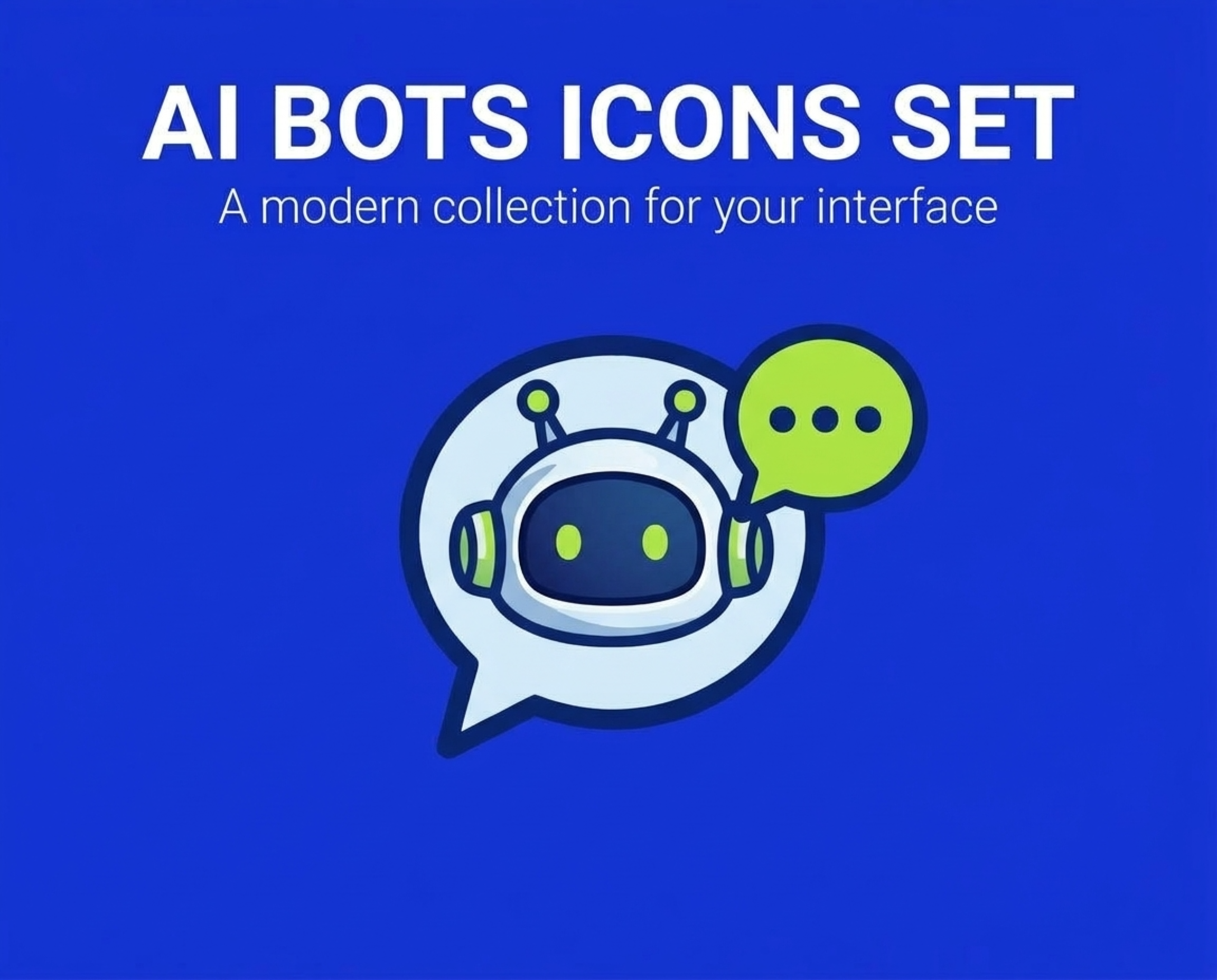 A vibrant collection of AI bot icons designed for modern user interfaces, featuring a friendly robot with a speech bubble, ideal for tech and communication applications.
