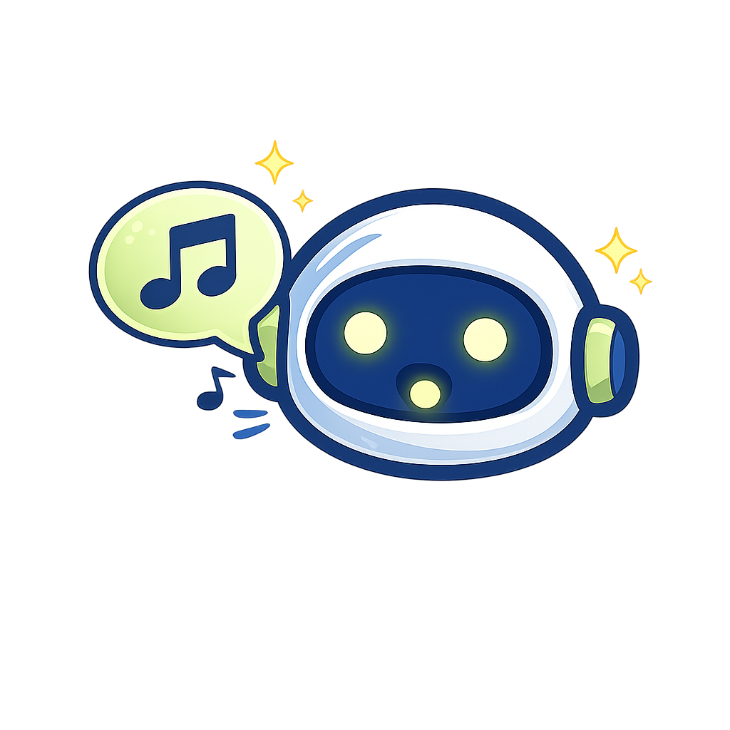 A charming cartoon robot in a space suit, with a cheerful expression and a music note bubble, radiating fun and creativity.
