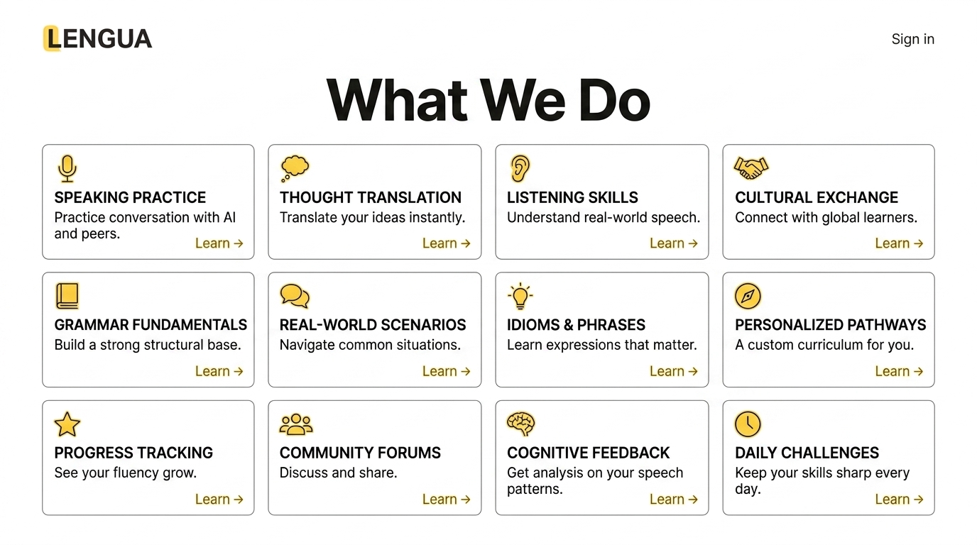 An informative overview of language learning features including speaking practice, thought translation, and cultural exchange, designed to enhance fluency and skills.