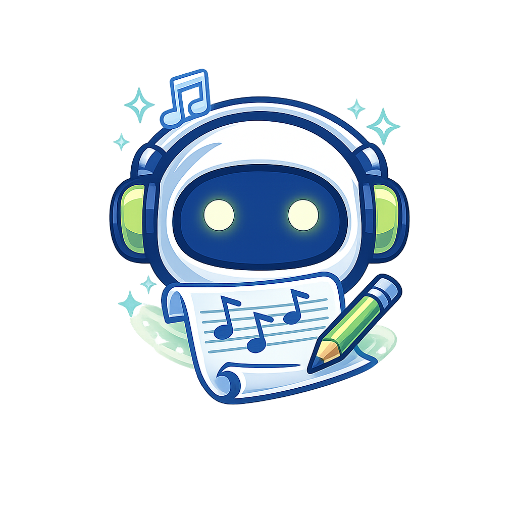 A playful robot character wearing headphones, holding a music sheet and pencil, surrounded by glowing musical notes. The design is colorful and cartoonish.