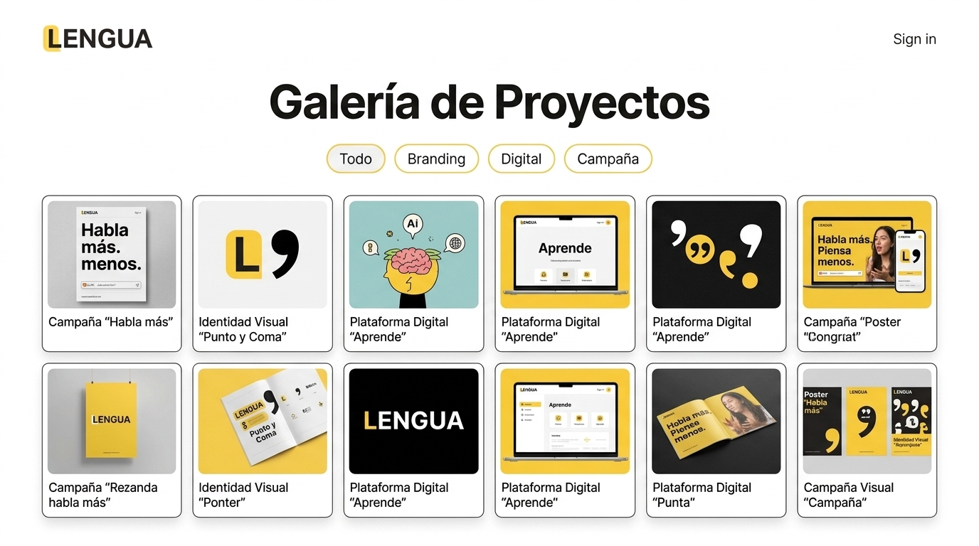 A visually appealing gallery showcasing various branding and digital projects, including visual identities and campaign designs. Focuses on modern graphic elements.