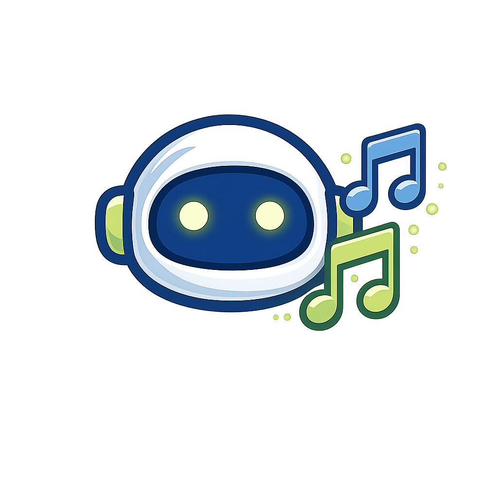 A cheerful robot character wearing a white helmet, with big expressive eyes. Surrounding it are glowing musical notes, creating a vibrant, fun atmosphere.