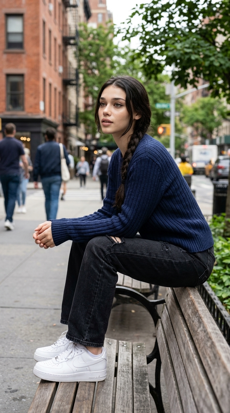 A young woman with long dark hair is sitting on a wooden bench in an urban environment. She wears a navy sweater and black jeans, looking contemplatively at the street.