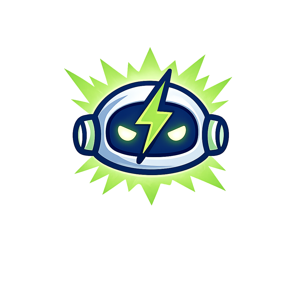 A stylized robot head featuring glowing green accents and a lightning bolt. The design is modern and playful, ideal for technology or gaming themes.